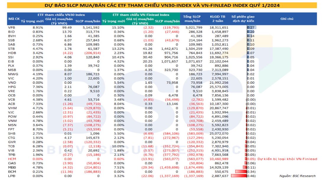 Đối với kỳ dự báo lần này, căn cứ trên số liệu kết thúc tại ngày 29.12.2023, BSC Research đưa ra dự báo danh mục các cổ phiếu thuộc bộ chỉ số VN30, VN-Finlead.