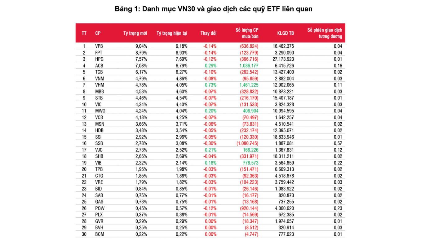 BSC dự báo bộ chỉ số VN30-Index sẽ không thêm mới và loại bỏ cổ phiếu nào trong kỳ đánh giá lần này. Ảnh: BSCĐồng quan điểm, SSI Research cũng cho biết, chỉ số VN30 có thể sẽ không thay đổi về danh mục. Ước tính, VPB sẽ giảm tỉ trọng từ 9,18% xuống còn 9,04%; FPT từ 8,93% xuống c8,79%; HPG giảm từ 7,69% xuống 7,57%... Chiều ngược lại, ACB (6,79%), MWG (4,04%), VJC (2,52%), VIB (2,14) có xu hướng tăng tỉ trọng khoảng 0,2 - 0,3 điểm phần trăm. Riêng tỉ trọng VHM tăng nhiều hơn, khoảng 0,7 điểm phần trăm lên 4,78%.