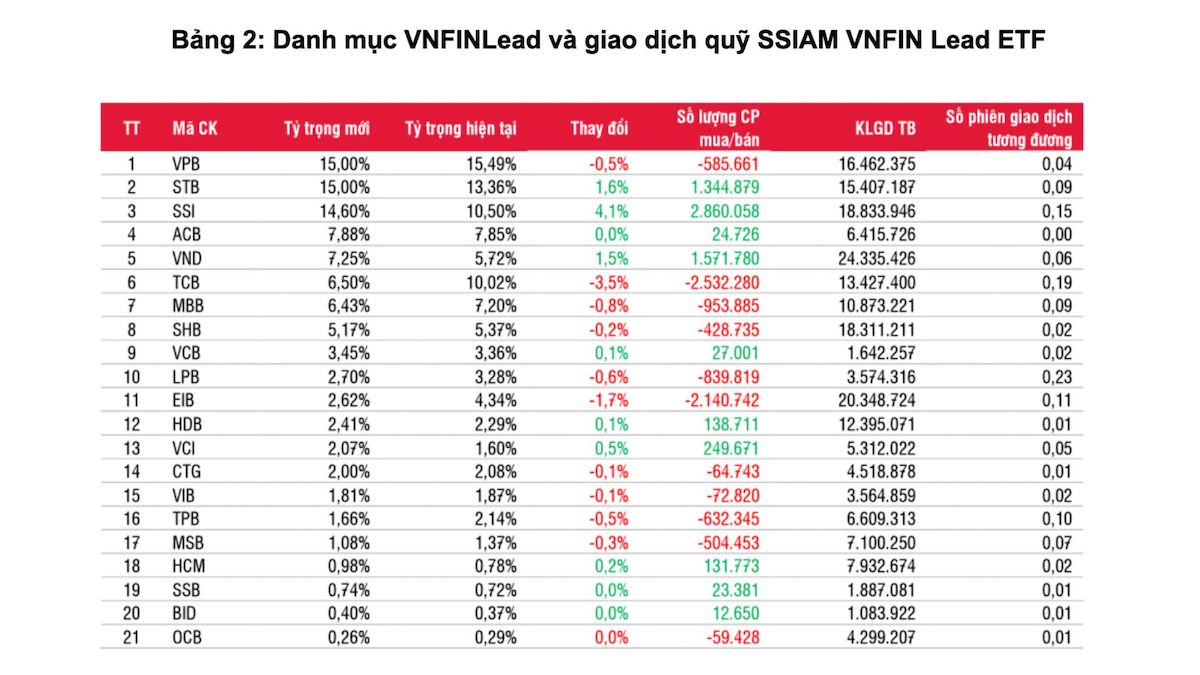 Còn với VNFINLead, chuyên gia dự báo không có sự thay đổi về danh mục 21 cổ phiếu này. Theo ước tính, SSI được mua vào nhiều nhất 2,86 triệu cổ phiếu, VND được mua vào nhiều thứ hai 1,5 triệu cổ phiếu, tiếp theo là STB 1,34 triệu cổ phiếu... Ở chiều ngược lại, TCB bị bán ra nhiều nhất 2,5 triệu cổ phiếu, EIB bị bán 2,1 triệu mã, MBB bị bán 953 nghìn mã...