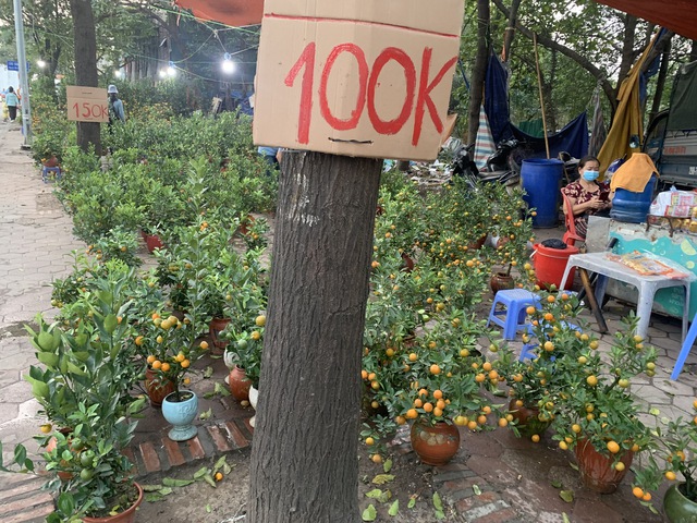 Bắt đầu từ chiều 4.2, gian hàng của anh Bình bán quất Văn Giang đồng giá 100.000 đồng/chậu, quất Tứ Liên giá cao hơn với 2 loại 150.000 đồng/chậu và 250.000 đồng/chậu.