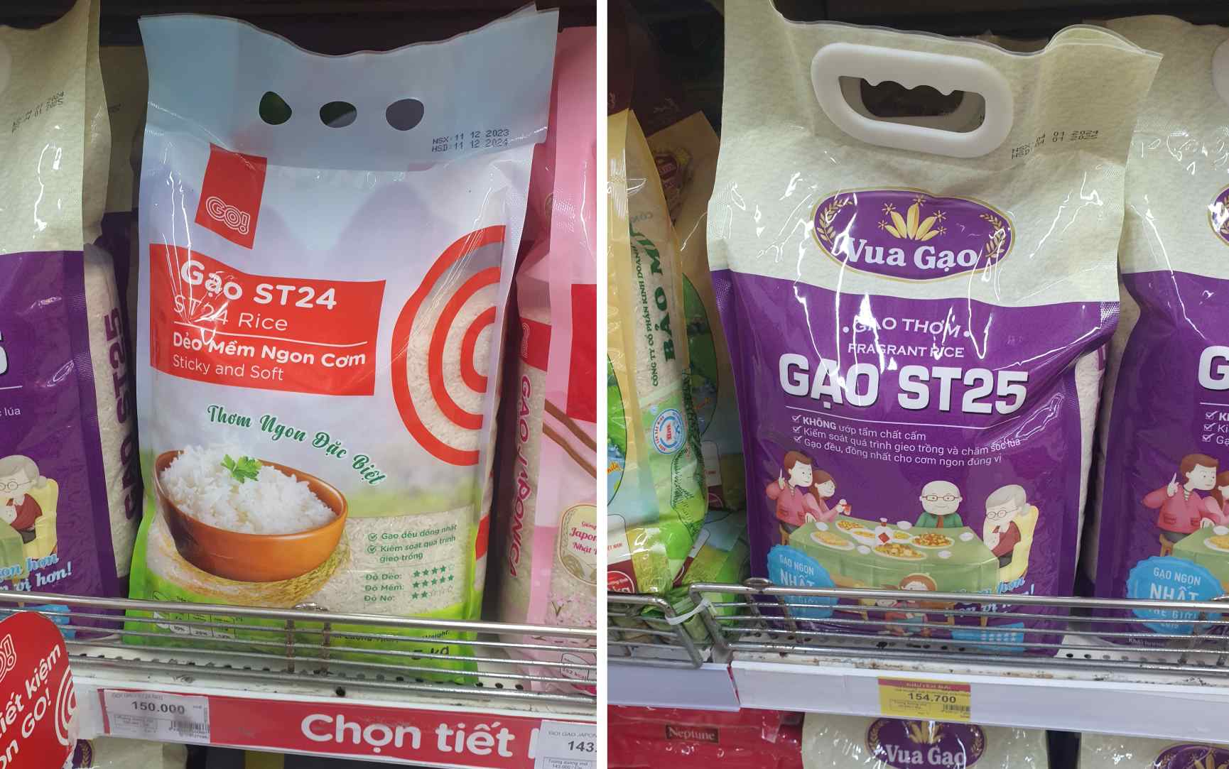 Giá gạo tại siêu thị vẫn duy trì ổn định. Ảnh: Khương DuyGhi nhận của PV tại Hà Nội, giá các loại gạo bán lẻ tại các chợ, siêu thị vẫn khá ổn định. Cụ thể, gạo ST24 thơm Cát Tường có giá 154.000 đồng/bao 5kg; gạo ST25 Cát Tường bao 5kg có giá 189.900 đồng; ST25 Bảo Minh có giá 138.900 đồng/bao 3kg; gạo Go ST24 bao 5kg có giá 150.000 đồng.