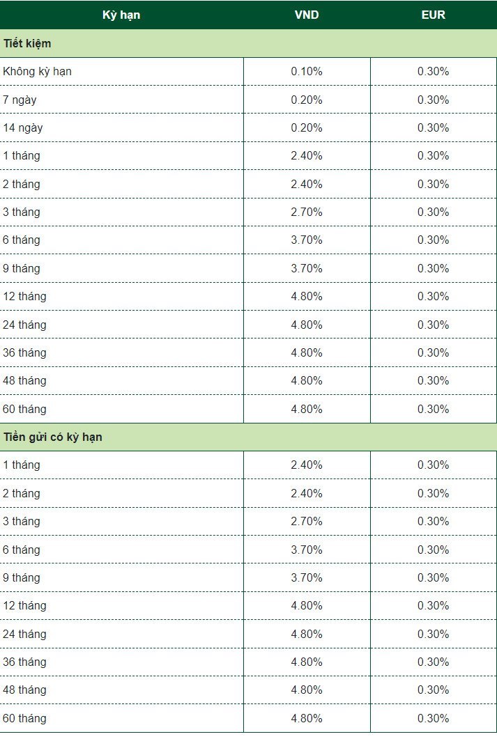 Trong đó, Vietcombank tiếp tục điều chỉnh giảm lãi suất. Ngân hàng này niêm yết lãi suất không kỳ hạn ở ngưỡng 0,1%/năm; 1-2 tháng ở ngưỡng 2,4%/năm; 3 tháng ở ngưỡng 2,7%/năm, 6-9 tháng ở ngưỡng 3,7%/năm; các kỳ hạn từ 12 đến 60 tháng ở ngưỡng 4,8%/năm.