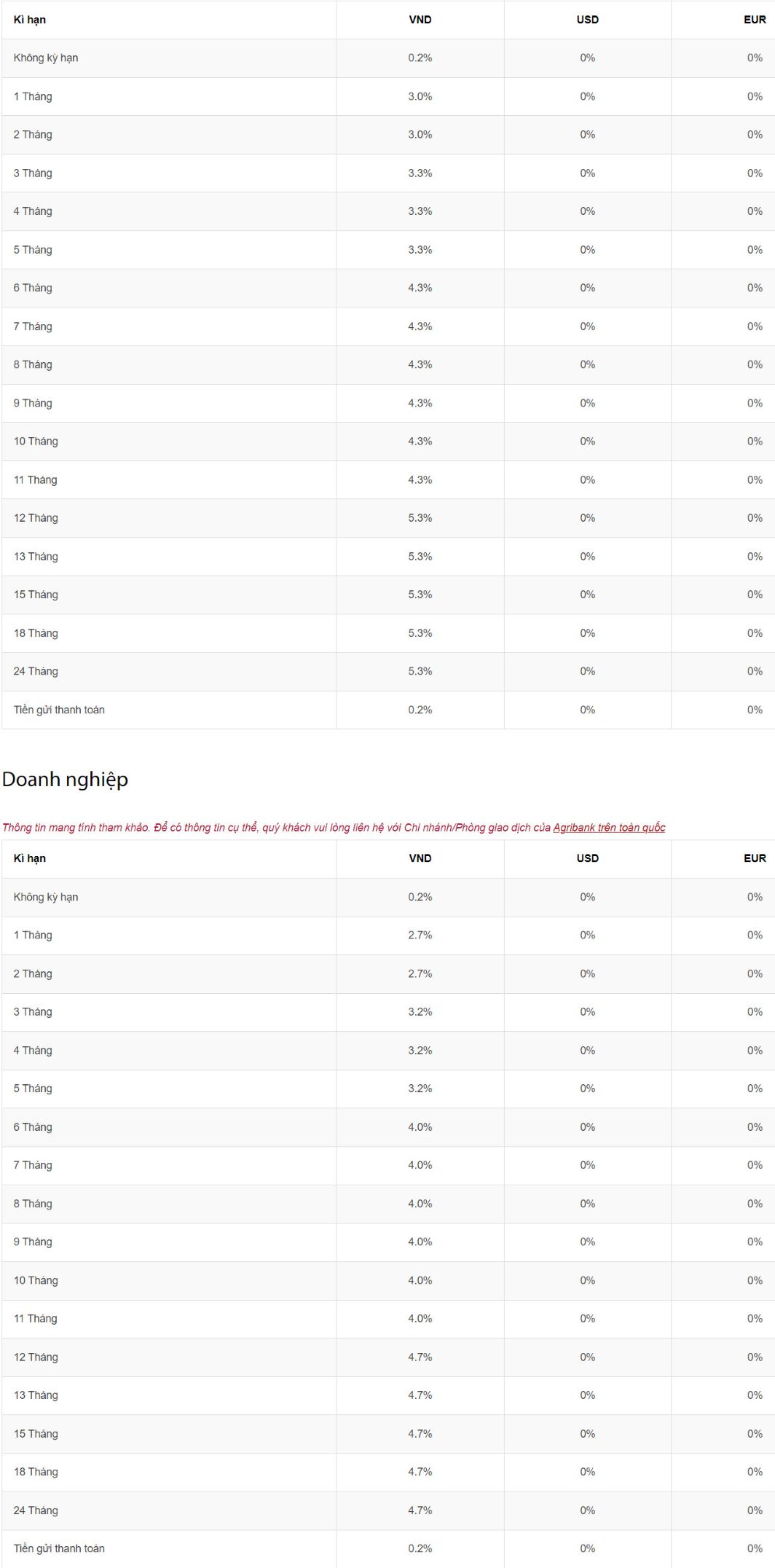 Trong khi đó, Agribank niêm yết lãi suất quanh ngưỡng 3-5,3%/năm. Ngân hàng này niêm yết lãi suất không kỳ hạn ở ngưỡng 0,2%/năm; 1-2 tháng ở ngưỡng 3%/năm; 3-4-5 tháng ở ngưỡng 3,3%/năm; 6-7-8-9-10-11 tháng ở ngưỡng 4,3%/năm; các kỳ hạn từ 12 đến 24 tháng ở ngưỡng 5,3%/năm.