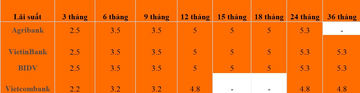 Ghi nhận của PV Lao Động với bốn ngân hàng Vietcombank, Agribank, VietinBank và BIDV vào ngày 1.1.2024, biểu lãi suất huy động đang được niêm yết quanh ngưỡng 2,2-5,3%/năm.