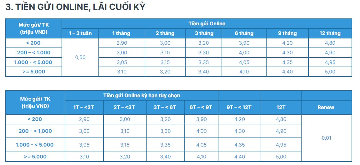Đối với hình thức gửi tiết kiệm online, lãi suất ACB đang niêm yết ở ngưỡng từ 2,9 - 5,0%. Trong đó, kỳ hạn gửi tiết kiệm lãi suất cao nhất là 12 tháng.