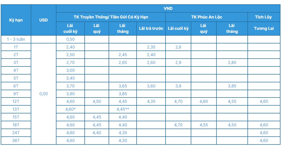 Trong đó, biểu lãi suất ACB đang áp dụng là 2,4 - 4,6%, tuỳ từng kỳ hạn. Trong đó, lãi suất ACB thấp nhất là 2,4%, khi khách hàng gửi tiết kiệm 1 tháng.