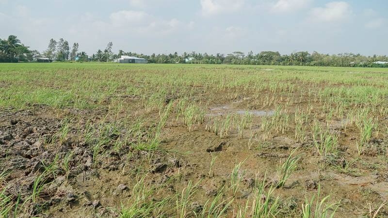 Tương tự, ông Thạch Lâm (ở thị trấn Long Phú, huyện Long Phú) xuống giống hơn 1ha. Hiện nay, trà lúa đã được 46 ngày tuổi và đang bị ảnh hưởng bởi nước mặn xâm nhập.