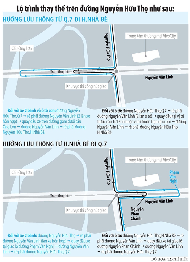 Điển hình, nút giao Nguyễn Văn Linh - Nguyễn Hữu Thọ (Q.7) đang là nút thắt lớn nhất, bóp nghẹt giao thông khu nam TP. Đều đặn sáng nào cũng vậy, từ 7 giờ, hàng dài xe bồn, xe tải, xe con chia nhau dàn hàng hết hai làn đường, kéo dài hơn 1 km từ đoạn giao với đường Đông Tây (xã Phước Kiển, H.Nhà Bè) tới tận vòng xoay Nguyễn Văn Linh - Nguyễn Hữu Thọ. Cầu Rạch Đĩa 2 ngày hai lần sáng - chiều, chia đều hai hướng biến thành những "bãi đậu xe" khổng lồ, xe máy chen chúc len lỏi vào trong làn ô tô, leo lên cả phần cầu dành cho người đi bộ. Mỗi lần chủ đầu tư thông tin mở rộng thi công, tăng tốc thi công là thêm một lần diện tích mặt đường bị bó hẹp. Rồi những đoạn lồi lõm, ổ gà bắt đầu xuất hiện, khiến phương tiện càng di chuyển khó khăn hơn, chậm hơn.