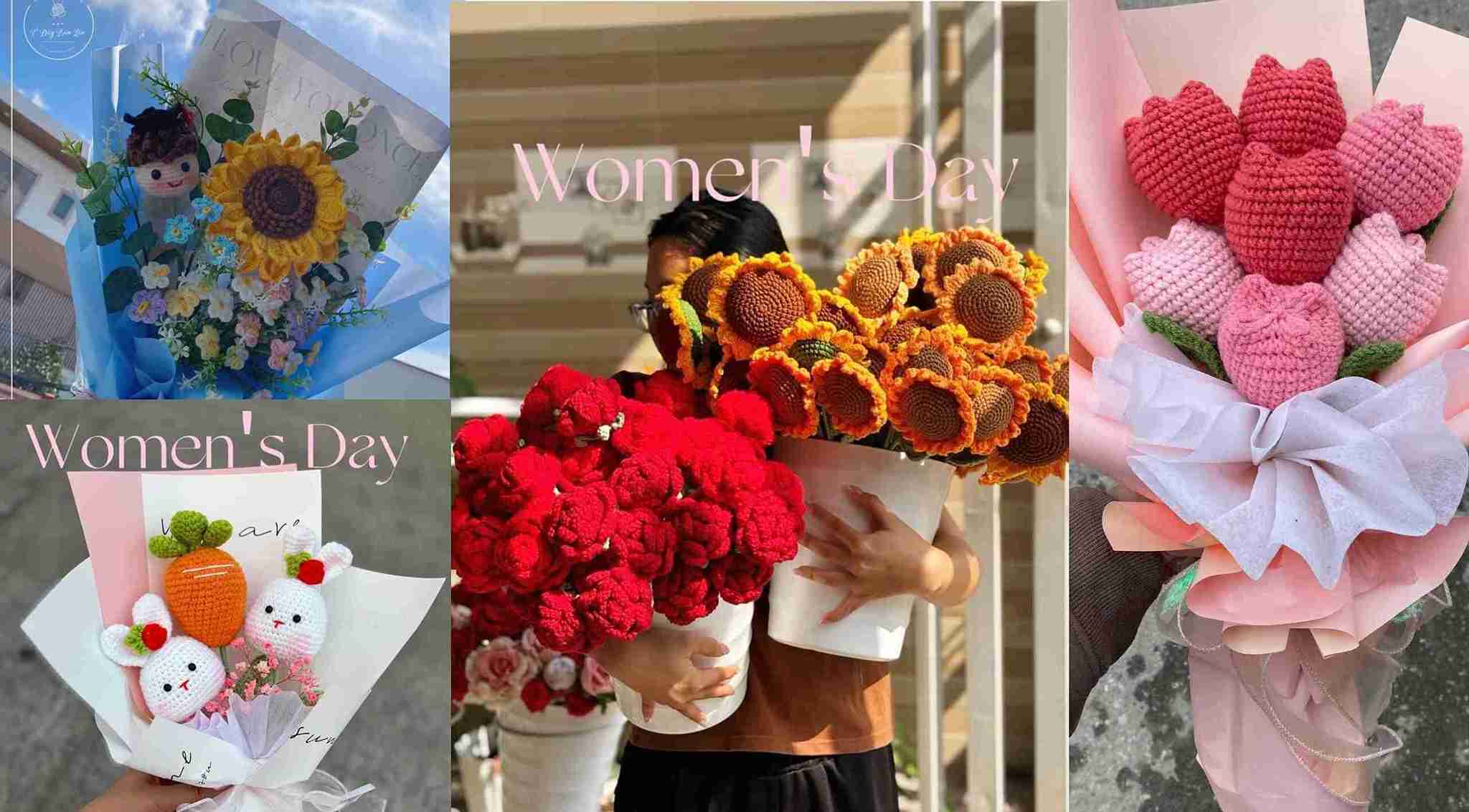 Mặt hàng hoa len handmade được nhiều người ưu tiên làm quà tặng 8.3. Ảnh: Chụp màn hình“Ngoài kiểu dáng bắt mắt, hoa len handmade còn có độ bền cao. Các bó hoa được đan từ len, có thêm phụ kiện như gấu bông, mỹ phẩm,... có giá từ 300.000 đồng được nhiều người đặt hàng. Cũng có khách hàng đặt bó hoa len to, kèm theo mỹ phẩm hơn 2 triệu đồng”, chị Tuyết Hương nói.