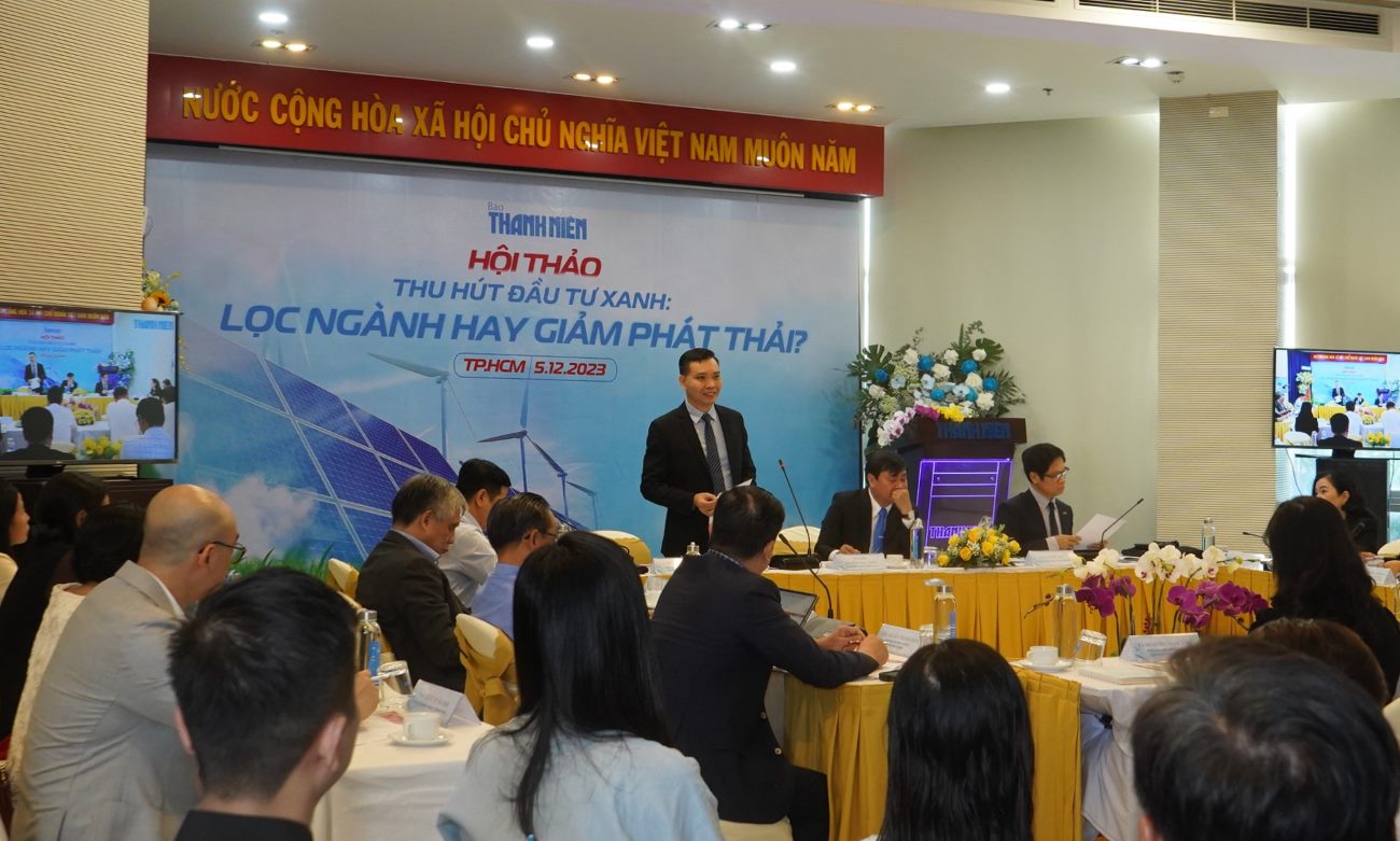 Quang cảnh Hội thảo “Thu hút đầu tư xanh: Lọc ngành hay giảm phát thải?". Ảnh: Phương NgânTại Hội thảo "Thu hút đầu tư xanh: Lọc ngành hay giảm phát thải?" do Báo Thanh Niên tổ chức ngày 5.12, bà Nguyễn Thị Thảo Nhi - Chủ tịch HĐQT kiêm Tổng giám đốc Công ty CP Thanh Bình Phú Mỹ (tỉnh Bà Rịa - Vũng Tàu) - cho rằng, các cơ quan quản lý phải định nghĩa lại phát triển xanh. Không thể chỉ nghe doanh nghiệp sản xuất vật liệu cơ bản, hóa chất cơ bản là xếp vào ngành ô nhiễm.