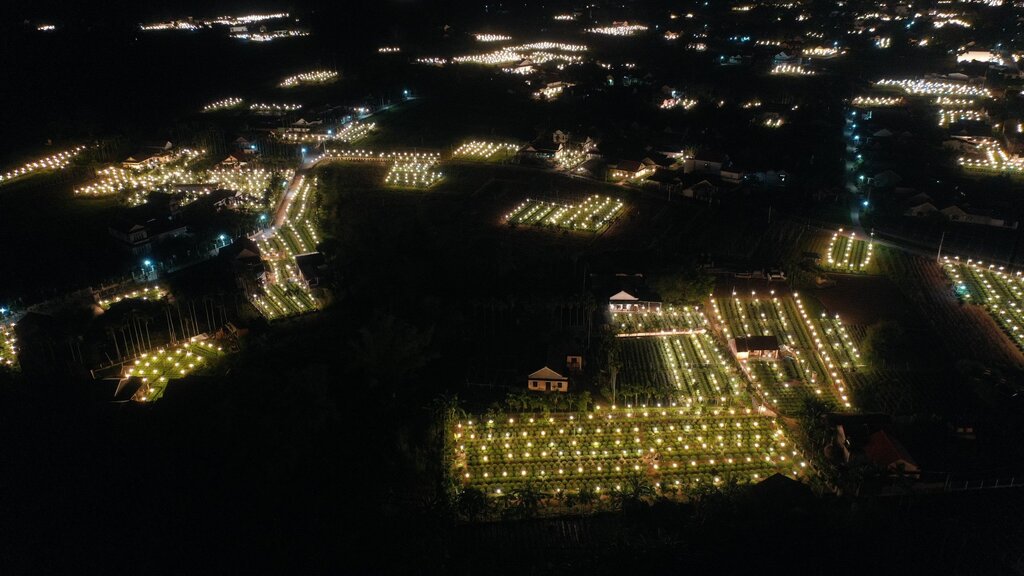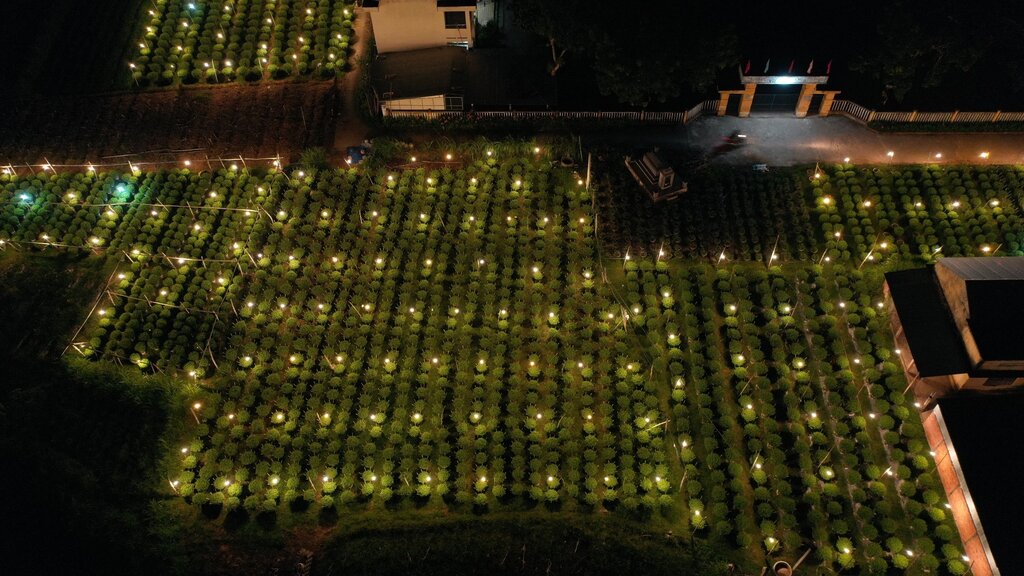 Ban đêm, người trồng hoa cúc ở xã Nghĩa Hiệp chong đèn suốt đêm, để sưởi ấm cho hoa cúc. Ảnh: Ngọc ViênCác xã Nghĩa Hiệp, Nghĩa Mỹ - huyện Tư Nghĩa là vùng chuyên canh hoa cúc Tết lớn nhất miền Trung. Vụ hoa Tết 2024, toàn xã có khoảng 500 hộ trồng hoa Tết với khoảng hơn 300.000 chậu hoa. Những ngày này, người trồng hoa Tết ở đây đang tích cực bón phân, tỉa cành, chăm sóc kỹ lưỡng vườn hoa để phục vụ thị trường Tết Nguyên đán 2024