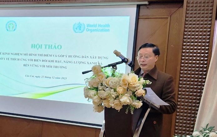 Ông Lò Văn Tùng chia sẻ về xây dựng cơ sở y tế thích ứng với biến đổi khí hậu, năng lượng xanh và bền vững với môi trường. Ảnh: Mai Lan“Để góp phần thực hiện cam kết đó, Bộ Y tế đã ban hành “Kế hoạch Hành động về ứng phó biến đổi khí hậu giai đoạn 2019-2030, tầm nhìn đến năm 2050”, mục tiêu chung là “Tăng cường năng lực của các đơn vị y tế trong việc thích ứng với biến đổi khí hậu để ngăn chặn và giảm thiểu các rủi ro về môi trường và biến đổi khí hậu đối với hệ thống y tế và sức khỏe con người, nhằm mục tiêu bảo vệ và chăm sóc sức khỏe công cộng tốt hơn” – ông Tùng nói.