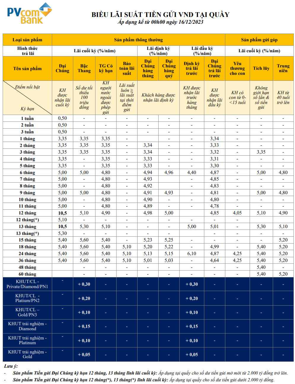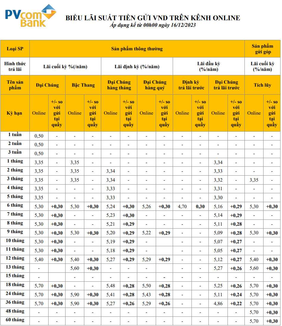 Cập nhật biểu lãi suất tại PVcomBank sáng 17.12.2023. Ảnh chụp màn hình.Gửi 300 triệu đồng, 24 tháng nhận lãi ra sao?