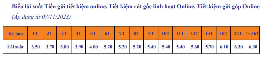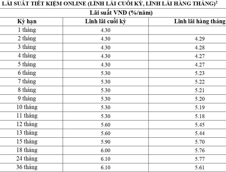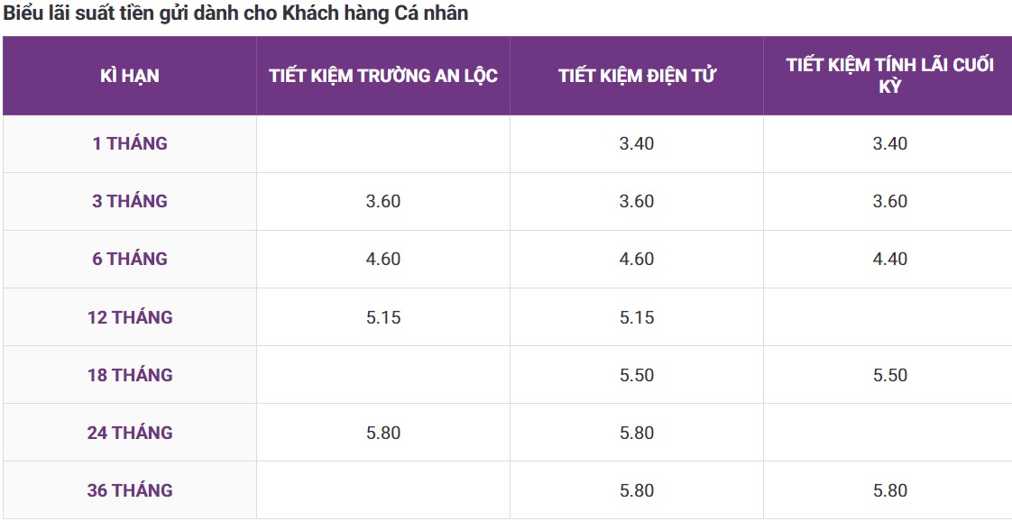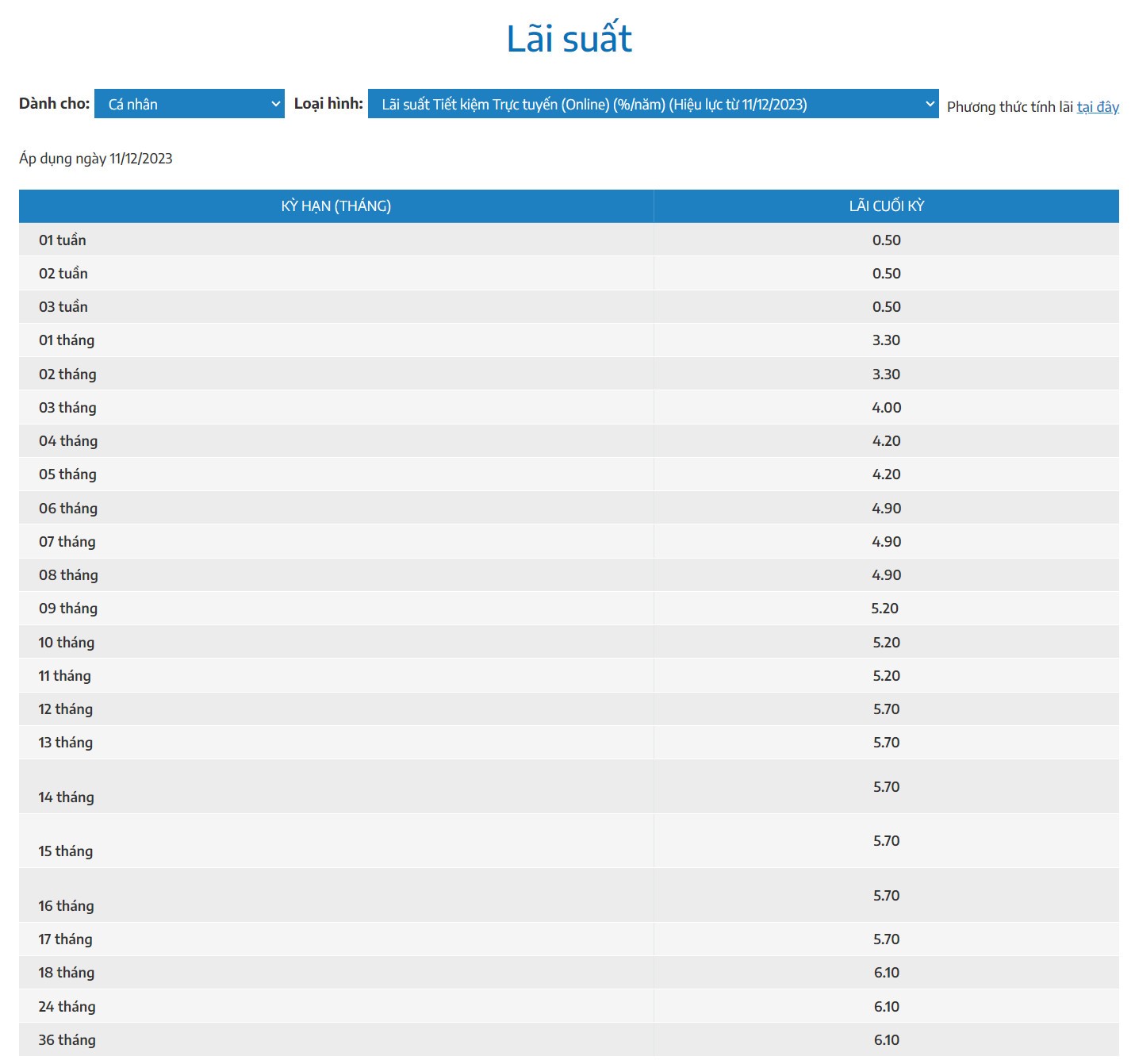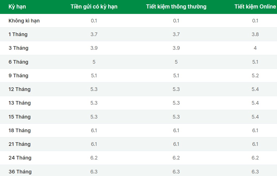 * Thông tin về lãi suất chỉ mang tính chất tham khảo và có thể thay đổi trong từng thời kì. Vui lòng liên hệ điểm giao dịch ngân hàng gần nhất hoặc hotline để được tư vấn cụ thể.