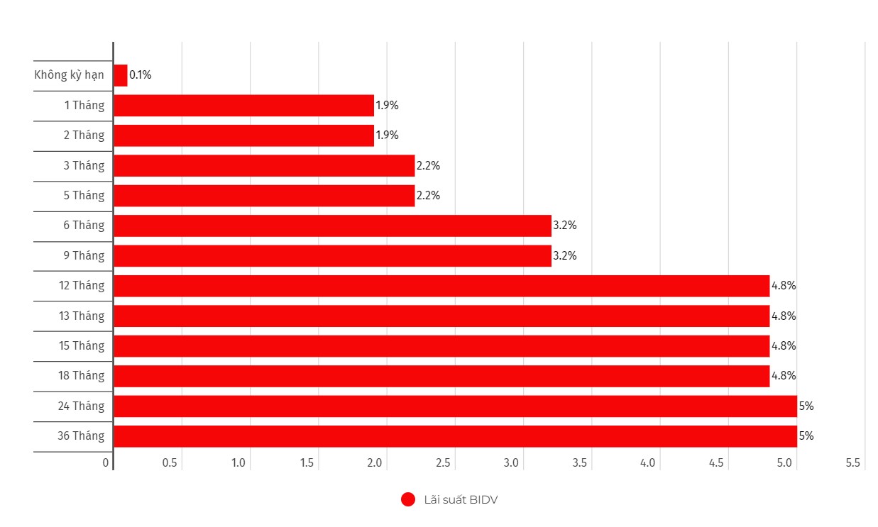 Cập nhật biểu lãi suất của BIDV. Đơn vị tính: %/năm. Biểu đồ: Khương DuyNgoài ra bạn đọc có thể tham khảo các ngân hàng có lãi suất cao nhất thị trường hiện nay: