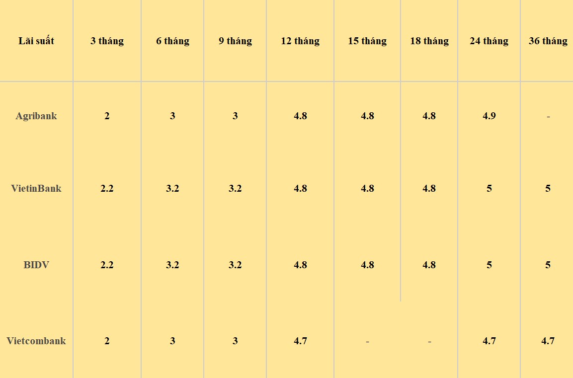 Nguồn: https://laodong.vn/tien-te-dau-tu/tron-bo-lai-suat-agribank-vietinbank-vietcombank-va-bidv-moi-nhat-1308244.ldo
