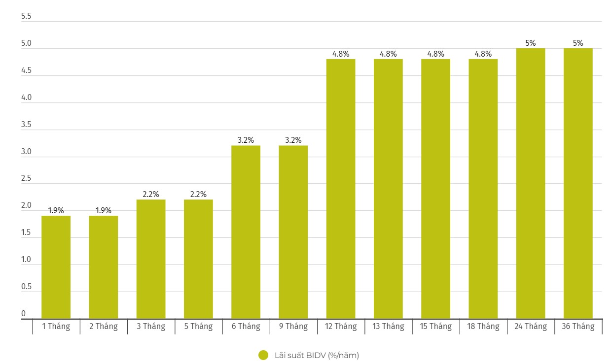 Cập nhật biểu lãi suất của BIDV. Đơn vị tính: %/năm. Biểu đồ: Khương DuyGửi tiết kiệm 1 tỉ đồng nhận lãi ra sao?