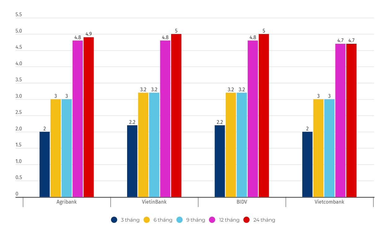Biểu đồ lãi suất một số kỳ hạn tại Vietcombank, Agribank, VietinBank và BIDV. Số liệu ghi nhận ngày 22.2.2024. Đơn vị tính: %/năm. Biểu đồ: Khương DuyDưới đây là biểu đồ chi tiết lãi suất các ngân hàng thuộc nhóm Big4: