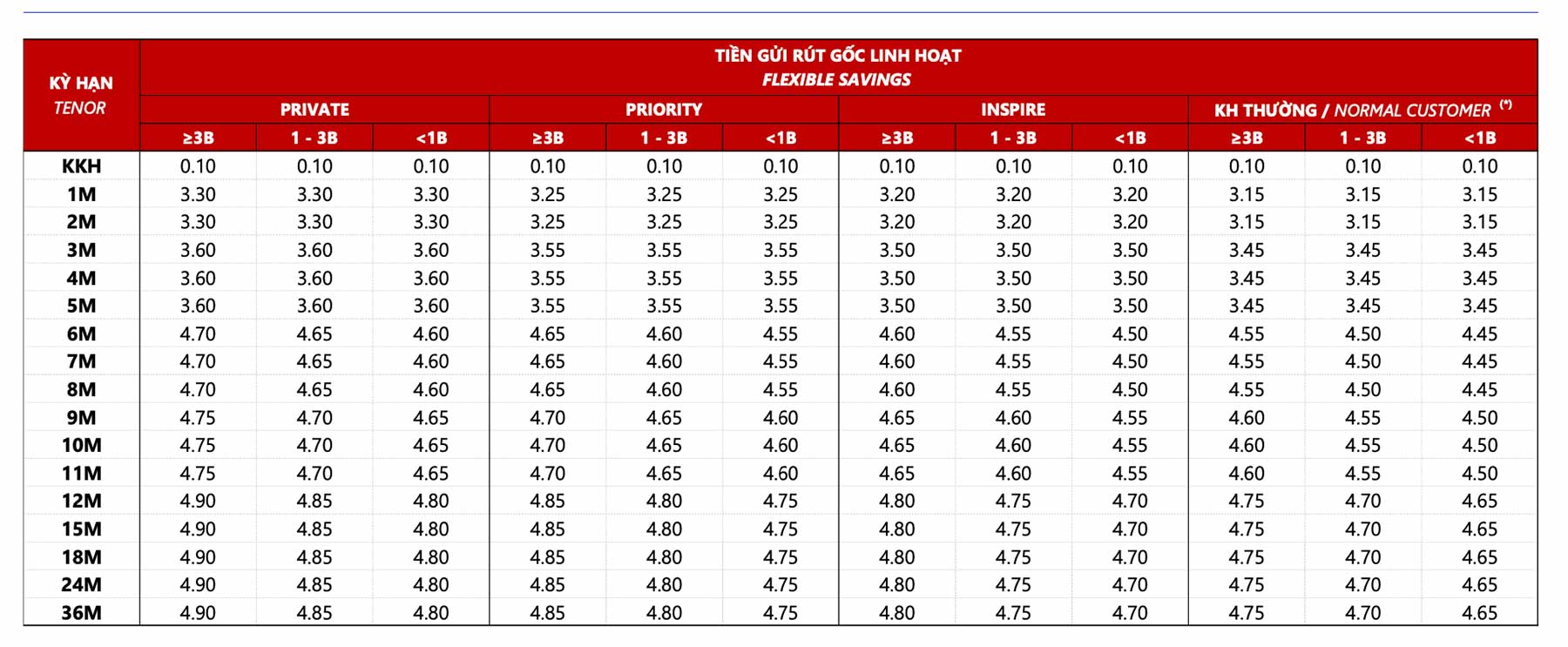 Đối với các khoản tiền gửi tiết kiệm thường trả lãi cuối kỳ, kỳ hạn 12 tháng, mức tiền gửi từ 999 tỉ đồng trở lên và khách hàng cam kết không được tất toán trước hạn áp dụng mức lãi suất 9,5%/năm.