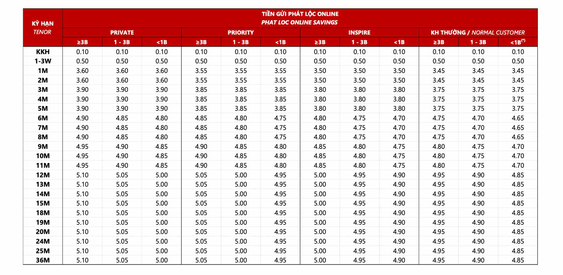 Tại Techcombank còn có hình thức gửi tiết kiệm online với lãi suất cao nhất là 5,1%/năm tại kỳ hạn 12 tháng, dành cho khách hàng gửi từ 3 tỉ đồng trở lên.