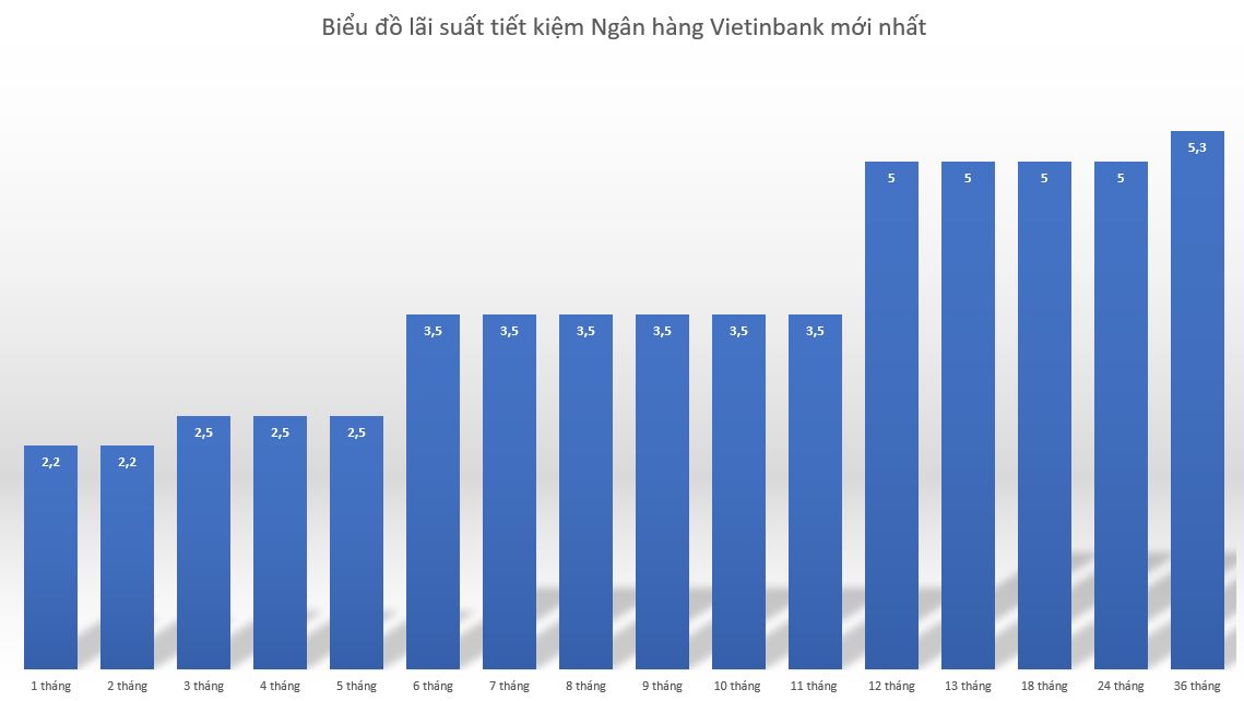Tại kỳ hạn gửi tiết kiệm 12 tháng đến 18 tháng, Vietinbank áp dụng mức lãi suất 5,0%. Riêng kỳ hạn 24 tháng, 36 tháng lãi suất Vietinbank cao nhất, ở mức 5,3%.