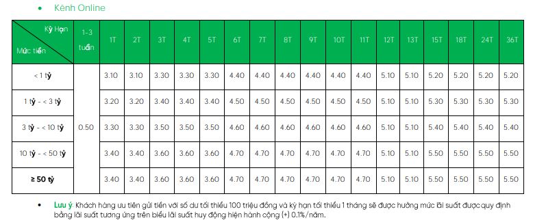 Đối với hình thức gửi tiết kiệm online, lãi suất VPBank cao nhất ở ngưỡng 5,5%. Điều kiện áp dụng với số tiền gửi từ 10 tỉ đồng trở lên; kỳ hạn gửi tiết kiệm từ 15 tháng trở lên.