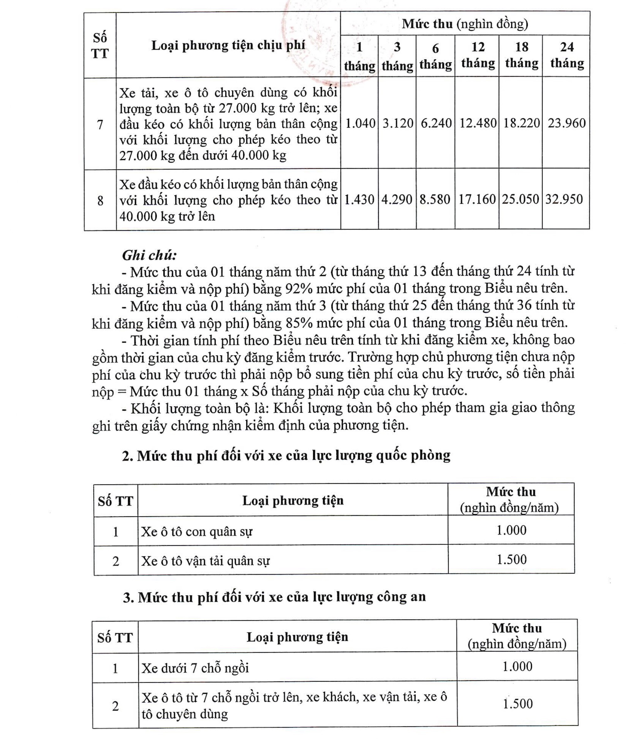Trường hợp nộp phí theo chu kỳ kiểm định (18 tháng, 24 tháng và 36 tháng): Đơn vị đăng kiểm cấp tem nộp phí sử dụng đường bộ tương ứng với chu kỳ kiểm định. Hết thời hạn nộp phí (chu kỳ kiểm định), chủ phương tiện phải đến đơn vị đăng kiểm để kiểm định và nộp phí cho chu kỳ kiểm định tiếp theo.
