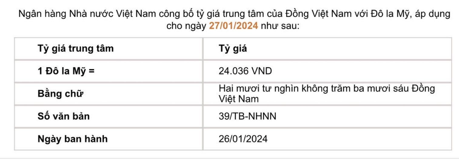 Tỷ giá trung tâm của đồng Việt Nam với đô la Mỹ do Ngân hàng Nhà nước công bố: