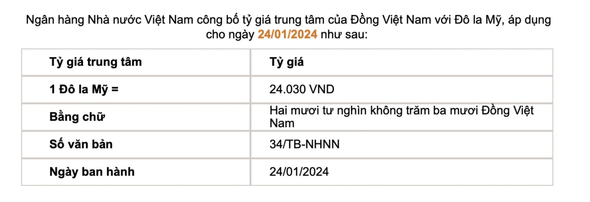Tỷ giá trung tâm của đồng Việt Nam với đô la Mỹ do Ngân hàng Nhà nước công bố: