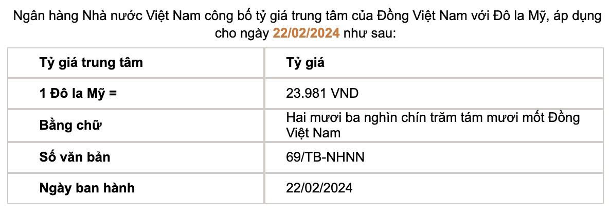 Tỷ giá trung tâm của đồng Việt Nam với đô la Mỹ do Ngân hàng Nhà nước công bố: