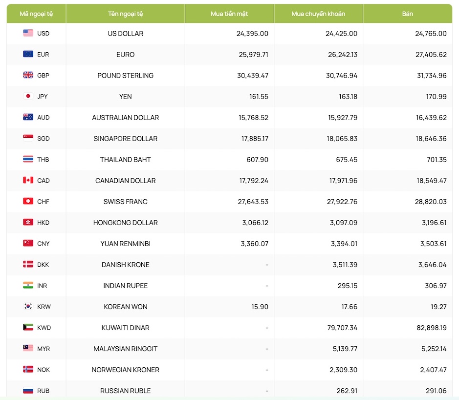 Ngân hàng Vietcombank niêm yết giao dịch mua - bán ở mức 24.395 - 24.765 VND/USD.