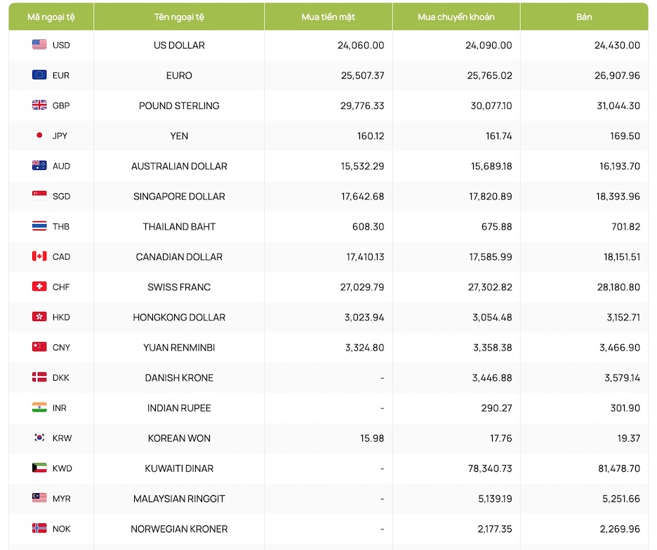 Ngân hàng Vietcombank niêm yết giao dịch mua - bán ở mức 24.060 - 24.430 VND/USD.