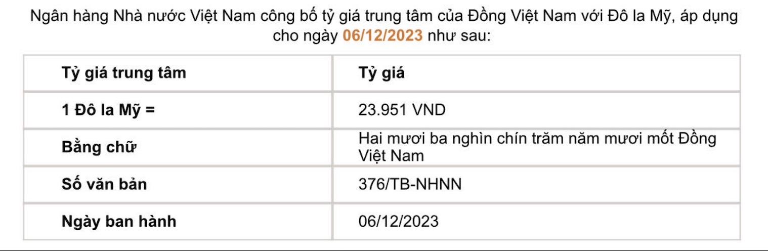 Tỷ giá trung tâm của đồng Việt Nam với đô la Mỹ do Ngân hàng Nhà nước công bố: