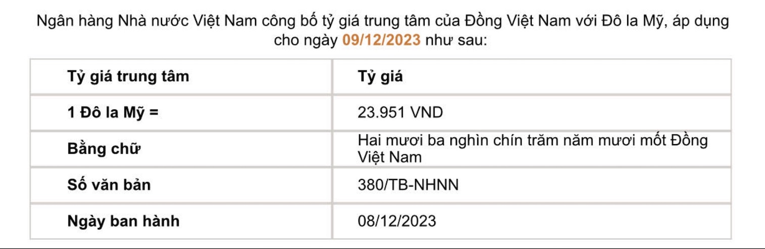 Tỷ giá trung tâm của đồng Việt Nam với đô la Mỹ do Ngân hàng Nhà nước công bố: