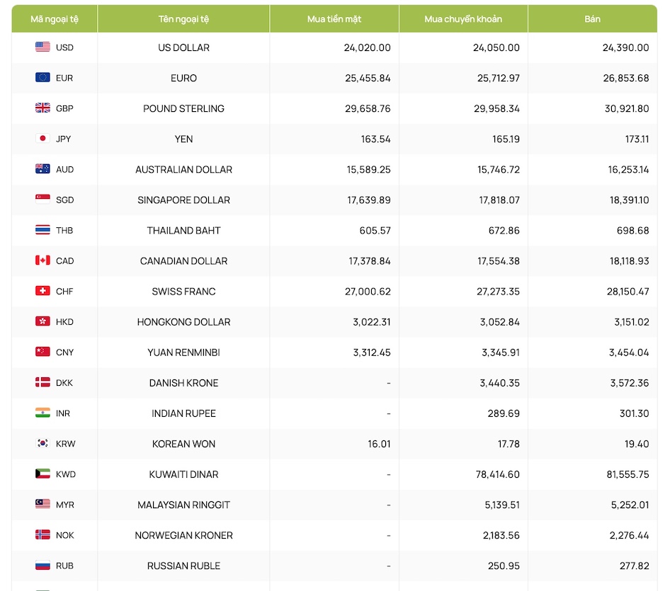 Ngân hàng Vietcombank niêm yết giao dịch mua - bán ở mức 24.020 - 24.390 VND/USD.