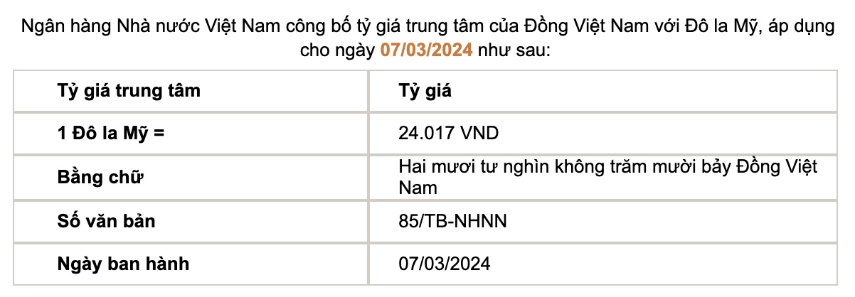 Tỷ giá trung tâm của đồng Việt Nam với đô la Mỹ do Ngân hàng Nhà nước công bố: