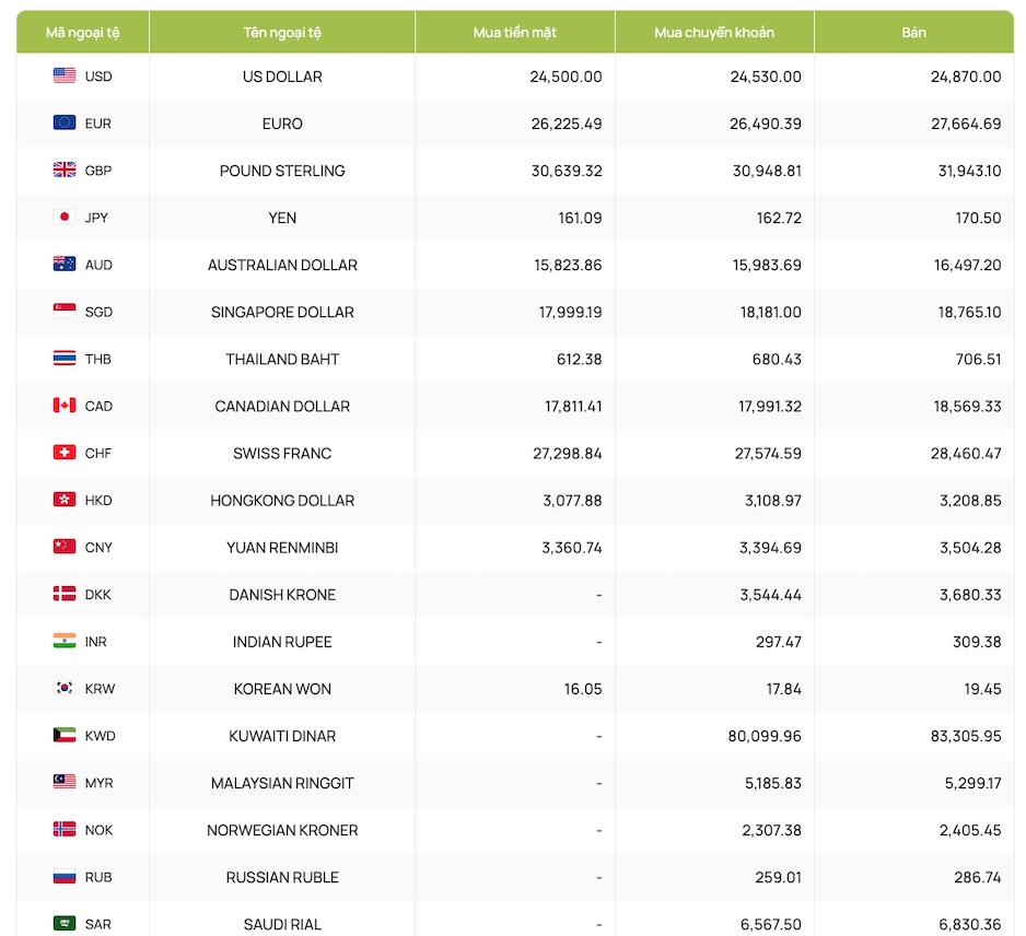 Ngân hàng Vietcombank niêm yết giao dịch mua - bán ở mức 24.500 - 24.870 VND/USD.