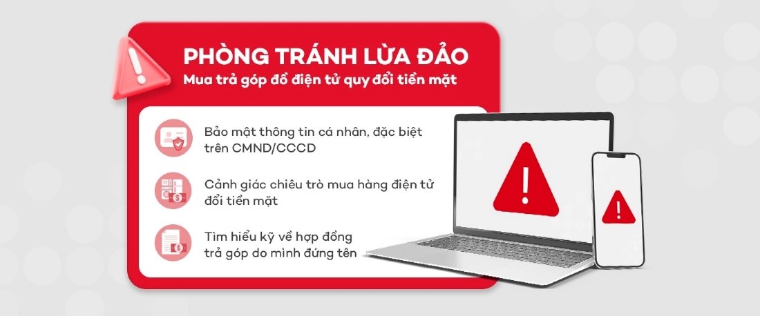 Home Credit đưa ra khuyến cáo phòng tránh lừa đảo mua trả góp đồ điện tử đến khách hàng. Ảnh: Hom CreditTheo đó, để tránh các trường hợp xấu trên, đại diện công ty tài chính Home Credit cho rằng khách hàng cần tuyệt đối bảo mật thông tin cá nhân, đặc biệt thông tin và hình ảnh trên CMND/CCCD, cảnh giác với các chiêu trò của các đối tượng xấu như quảng bá vay tiền nhanh thông qua hình thức mua hàng điện tử quy đổi tiền mặt đồng thời tìm hiểu kỹ về hợp đồng trả góp, đặc biệt là trách nhiệm thanh toán đối với hợp đồng do mình đứng tên.