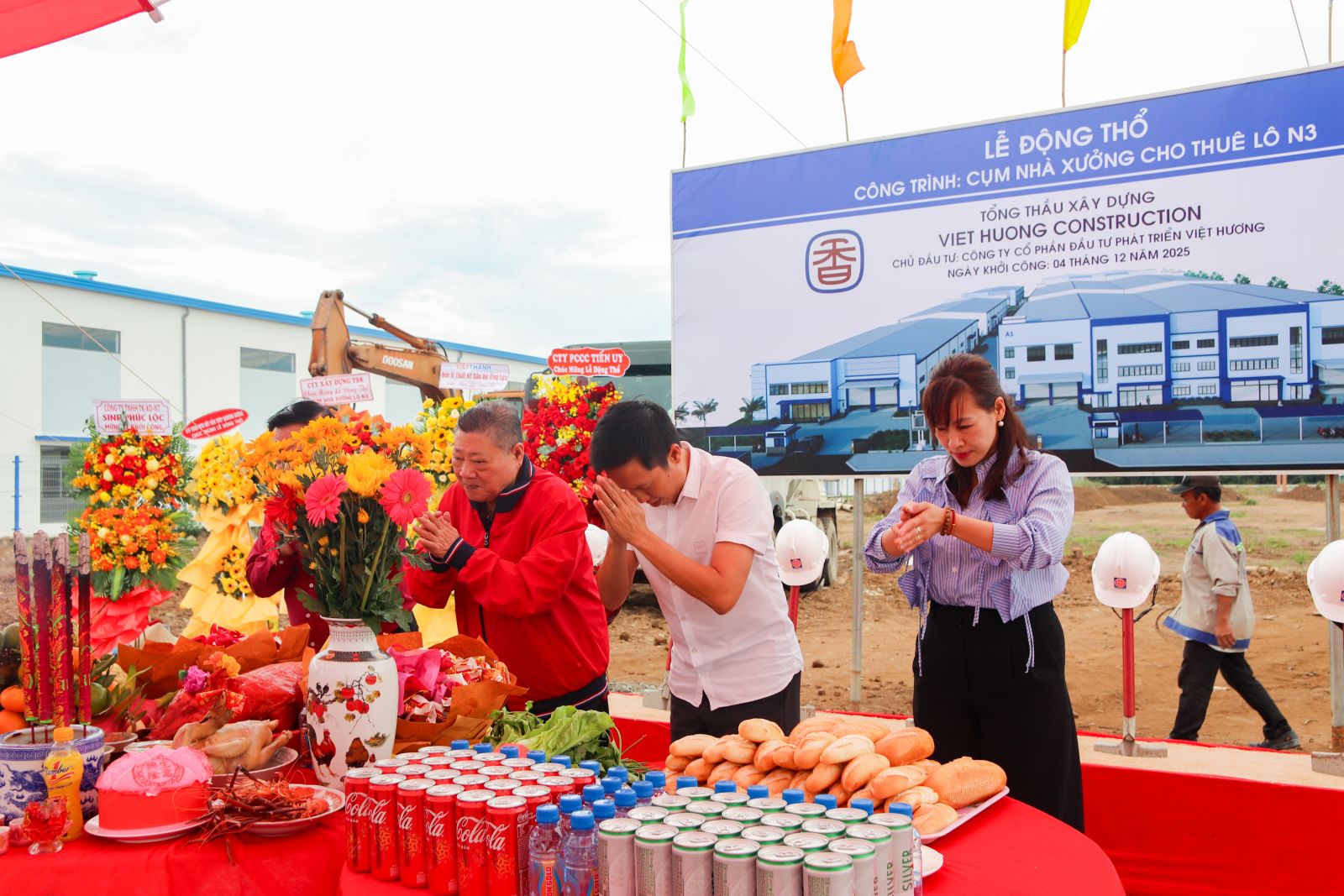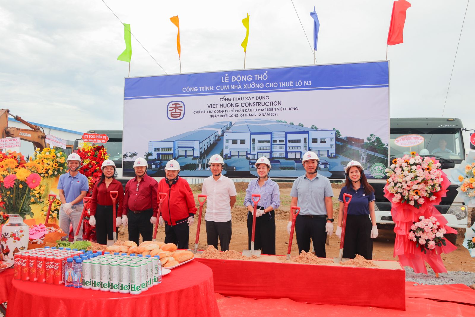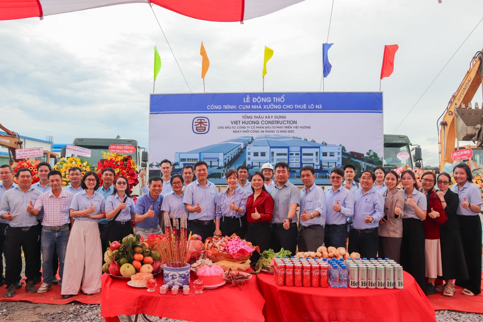 Sáng ngày 04/12/2025, Viet Huong Group đã long trọng tổ chức Lễ động thổ Công trình “Cụm nhà xưởng cho thuê lô N3” tại Khu công nghiệp Việt Hương 2, phường Tây Nam, TP.HCM. Buổi lễ vinh dự đón tiếp Chủ tịch HĐQT – Ông Hàng Vay Chi, các thành viên Ban Lãnh đạo, cùng toàn thể CBNV Viet Huong Group tham dự trong không khí trang trọng, phấn khởi và đầy kỳ vọng.