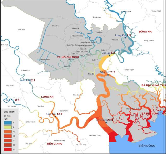 Th.S Lê Thị Xuân Lan, chuyên gia khí tượng thủy văn, cho biết: Năm nay xâm nhập mặn đến sớm và tăng nhanh do đang chuẩn bị bước vào đợt triều cường đầu tháng chạp. Bên cạnh đó, gió mùa đông bắc hoạt động mạnh trên Biển Đông đẩy nước biển vào sâu trong các con sông. Hiện tại các địa phương như Cần Giờ, Nhà Bè, Cát Lái bị ảnh hưởng. Khả năng ảnh hưởng sâu và nặng hơn trong các đợt triều cường sắp tới. Đến đầu tháng 2 âm lịch, xâm nhập mặn có thể ảnh hưởng đến khu vực nhà máy nước Thủ Đức.