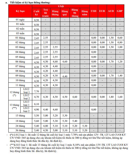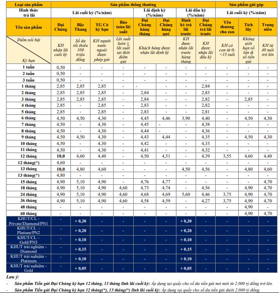 Thông tin về lãi suất chỉ mang tính chất tham khảo và có thể thay đổi trong từng thời kỳ. Vui lòng liên hệ điểm giao dịch ngân hàng gần nhất hoặc hotline để được tư vấn cụ thể.