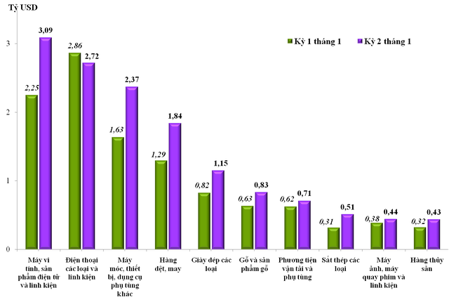 Trị giá xuất khẩu kỳ 2 tháng 1 tăng so với kỳ trước ở các nhóm hàng sau: máy vi tính, sản phẩm điện tử và linh kiện tăng 842 triệu USD, tương ứng tăng 37,5%; máy móc, thiết bị, dụng cụ và phụ tùng tăng 735 triệu USD, tương ứng tăng 45%; hàng dệt may tăng 548 triệu USD, tương ứng tăng 42,5%; giày dép các loại tăng 322 triệu USD, tương ứng tăng 39,1%; gỗ và sản phẩm gỗ tăng 200 triệu USD, tương ứng tăng 31,7%...