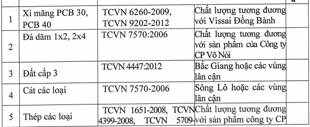 Gói thầu số 1 tại xã Quang Thịnh cũng đưa ra các điều kiện với vật liệu phổ biến trên thị trường như xi măng - chất lượng tương đương với Vissai Đồng Bành. Đá dăm - chất lượng tương đương với sản phẩm của Công ty Cổ phần Võ Nói. Thép - chất lượng tương đương với sản phẩm của Công ty Cổ phần Gang thép Thái Nguyên TISCO...